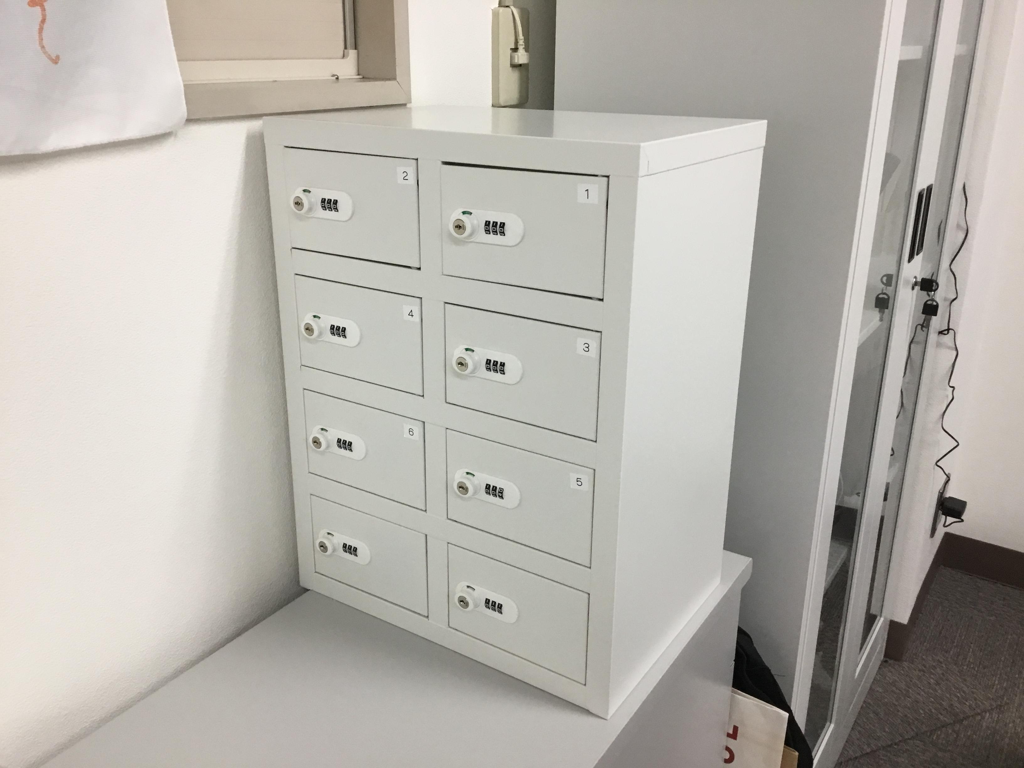 自席で荷物を管理できるカラーボックスと、貴重品を保管できる鍵付きロッカーを用意しています。